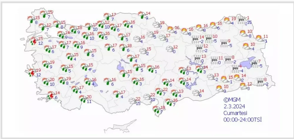 Meteoroloji Genel Müdürlüğü tarafından yapılan son tahminlere göre: Yurdun batı ve kuzey kesimlerinde parçalı ve çok bulutlu, diğer yerlerin az bulutlu ve açık, İzmir, Muğla, Aydın ve Balıkesir'in kıyı ilçelerinin akşam saatlerinden sonra sağanak ve gök gürültülü sağanak yağışlı geçeceği tahmin ediliyor.