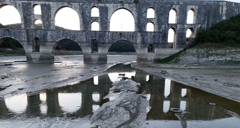 Yağışsız bir sonbahar geçiren İstanbul’a su sağlayan barajlardaki doluluk oranı, yüzde 36.48’e düştü. İSKİ verilerine göre, son 10 yılın en düşük su seviyesini gören Alibey Barajı’ndaki doluluk oranı yüzde 7.41’e geriledi. Alibey Barajı’nın 8 Ekim tarihi dikkate alınarak son 10 yıla bakıldığında en düşük doluluk oranı 2021 yılında yüzde 19.54 olarak ölçülmüştü. Alibey Barajı’nda geçen yıl bugün yüzde 24.76 olan doluluk oranı ise yüzde 7.41 olarak en düşük seviyeyi gördü. Suların büyük kısmının çekildiği barajın son durumu ise havadan görüntülendi. Görüntülerde, suların çekildiği alanda oluşan kuraklık endişe veren tabloyu bir kez daha gözler önüne serildi. Suların çekilmesi ile birlikte Mimar Sinan’ın eserleri olan Mağlova Kemeri ile Güzelce Kemeri’nin tamamen gün yüzüne çıktığı görüldü. Öte yandan, suları çekilen baraja atılan damacana gibi plastik atıklar da ortaya çıktı.