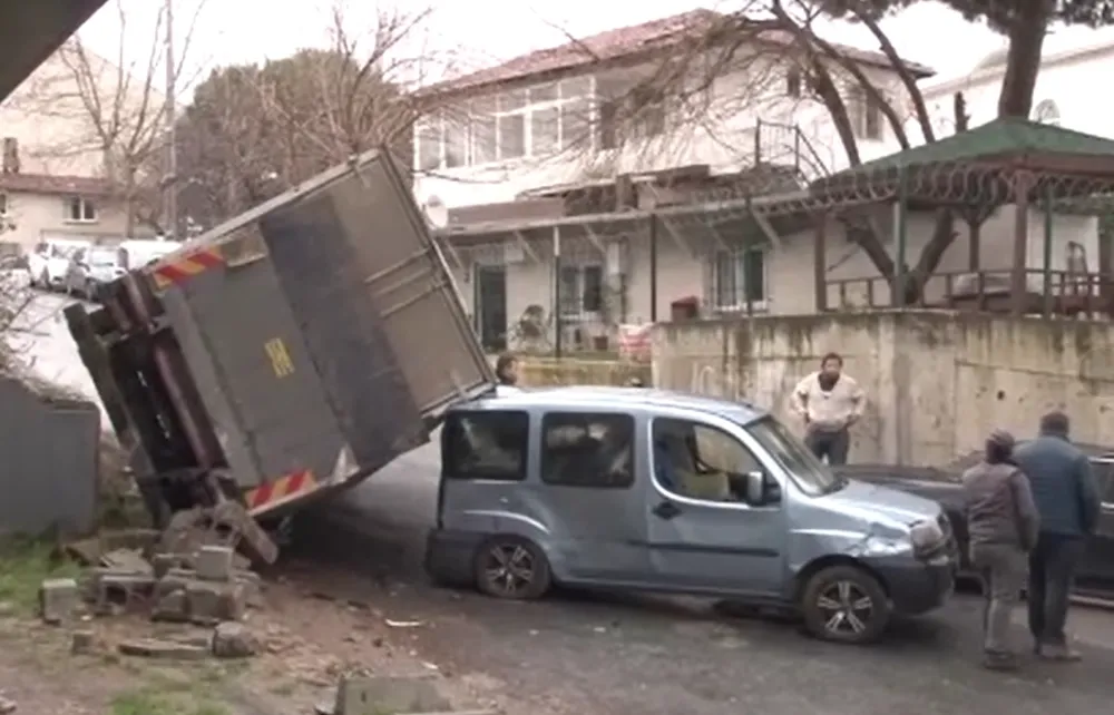 Ataşehir’de yokuş çıktığı sırada freni patlayan kamyon önce boş bir binanın istinat duvarına vurdu, ardından park halindeki aracın üzerine devrildi. Olayda ölen veya yaralanan olmadı.