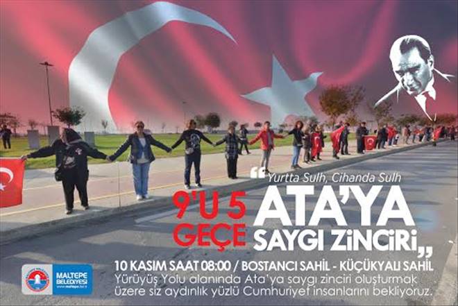 Atatürkün ölüm yıldönümünde Maltepe Belediyesi, anlamlı etkinliklere ev sahipliği yapacak. Maltepedeki anma etkinlikleri kapsamında sahilde, Ataya Saygı Zinciri oluşturulacak ve Atatürk mavi gözleriyle denizden çıkacak. Ayrıca her mahalleden 30 vatandaş, Anıtkabire götürülecek. Etkinlikler çerçevesinde 10 Kasım Salı günü saat 08.00dan itibaren, Kadıköy sahilinden Küçükyalıya kadar insan zinciri oluşturulacak. Binlerce vatandaşın katılımıyla oluşturulacak zincir sonrasında, Atatürkün hayata gözlerini yumduğu saat 9u 5 geçe, saygı duruşu yapılacak.