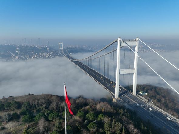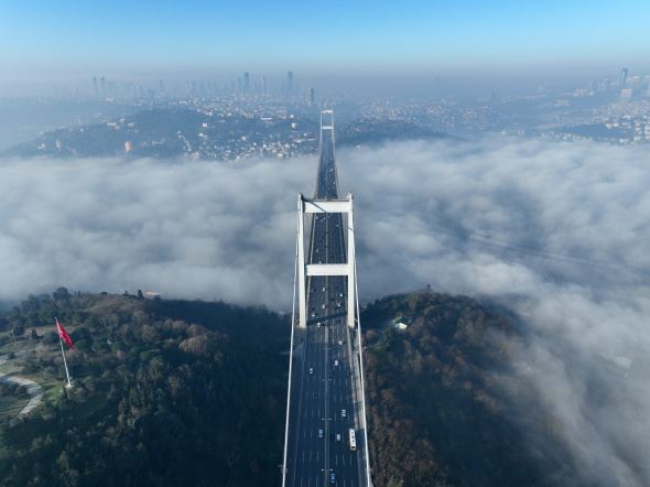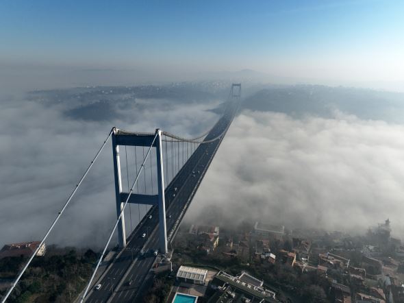 Yılın ilk gününe sis ile başlayan istanbul sakın bir giiş yaptı. İstanbul'da sabah saatlerinden itibaren etkisini gösteren sis, ilginç manzaraları da beraberinde getirdi. İstanbul Boğazı`nı kaplayan sis bulutu, Fatih Sultan Mehmet Köprüsü ile birlikte görüntülendi. Dron ile çekilen görüntüler, izleyenleri hayran bıraktı. Adeta sis bulutunun üzerinde asılı duran Fatih Sultan Mehmet Köprüsü ve üzerinden geçen araçlar, eşsiz bir manzara oluşturdu.