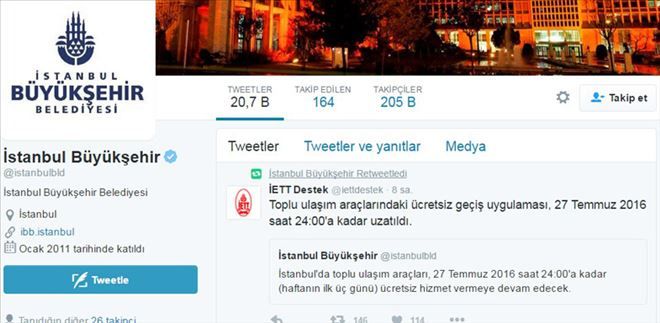İstanbul Büyükşehir Belediyesi İETT Destek twitter hesabından yapılan açıklamaya göre toplu ulaşım araçlarının üç gün daha ücretsiz olacak.İstanbul Büyükşehir Belediyesi İETT twitter hesabından yapılan açıklamaya göre toplu ulaşım araçlarının üç gün daha ücretsiz olacak. İETT Destek twitter hesabından yapılan açıklamada, 'İstanbul´da toplu ulaşım araçları, 27 Temmuz 2016 saat 00.00´a kadar (haftanın ilk üç günü) ücretsiz hizmet vermeye devam edecek' denildi.