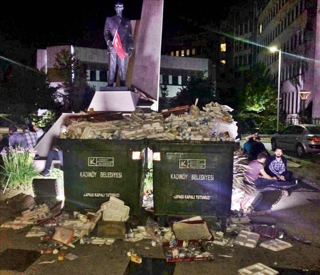 Kadıköy Belediyesi´nin hemen önünde, Atatürk büstünün önünde oluşan çöp dağları, Demokrasi Mitingi´ne katılanların tepkisi çekiyor. Katılımcılar, 'Burada Türk bayrağına, ülkesine sahip çıkan insanlara da Kadıköy Belediyesi´ne de bu yakışmıyor. Belediye buraya en azından bir görevli tahsis etmeli. Bu bir parti meselesi değil; bu bir millet meselesi, Kadıköy Belediyesi de bu harekete destek olmalı, elini taşın altına koymalıdır' diyerek, Kadıköy Belediye Başkanı Aykurt Nuhoğlu ve ekibini duyarlı davranmaya çağırdı.