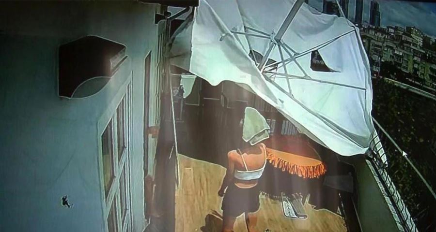 Ev sahibi Esat Delikenli, “Şiddetli rüzgar olmasına rağmen yan binamızda açık bırakılan şemsiye bizim terasımıza uçtu. O esnada terasta oturan arkadaşlarımız vardı. Hızla gelen şemsiyeyi terasımızdaki demir direğe takılması durdurdu. Şemsiyenin sahiplerinden gelip almalarını istedik ama maalesef gelmediler. Kendi imkanlarımızla şemsiyeyi kaldırdık” dedi.