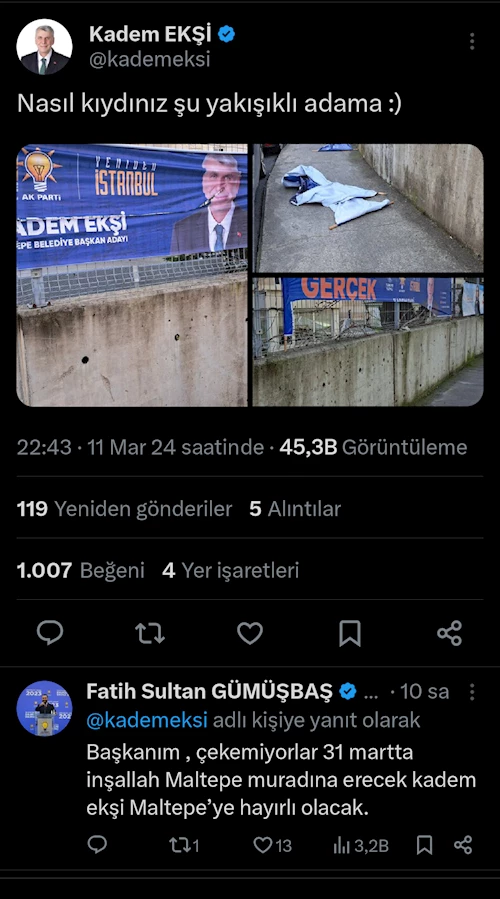 31 Mart Yerel Seçimlere sayılı günler kalırken, siyasi parti adayları arasındaki rekabet ve seçim çalışmaları bütün hızıyla devam ediyor. Seçim çalışmaları kapsamında asılan pankart ve afişlere yönelik yapılan bir saldırıya verilen yanıt ise büyük bir beğeni topladı. AK Parti Maltepe Belediye Başkanı Adayı Kadem Ekşi’nin, önceki akşam ilçe genelinde asılan pankart ve afişlerine yönelik kimliği belirsiz kişilerce saldırı düzenlendi. Pankartların büyük bir kısmı tahrip edilen ve kesilerek atılması üzerine, Başkan Adayı Ekşi tepkisini sosyal medya üzerinden gösterdi. Ekşi X hesabında “ Nasıl kıydınız şu yakışıklı adama :)” mesajı sosyal medyada gündem oldu. Tepkisini espri ve hoşgörülü bir şekilde dile getirmesine de sosyal medya âlemi ilgisiz kalmadı. Binlerce beğeni ve 45 binden fazla görüntülenme alan mesaja seçmenlerde “Gösterilen hoşgörü, iyi niyet ve nezaketinden” dolayı, Kadem Ekşi’ye takdir ve teşekkürlerini ilettiler.