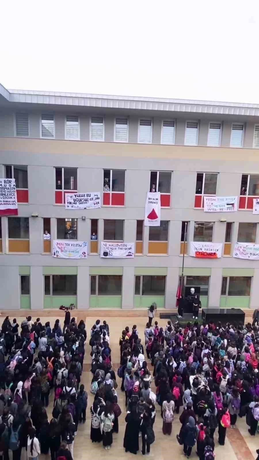 İsrail’in Filistinlilere yönelik katliamlarına karşı, Pendik’te bulunan Şehit Adil Büyükcengiz Anadolu İmam Hatip Lisesi öğrencileri protesto yaptı. Öğrenciler, Filistin’e destek olmak için hep bir ağızdan ’Bir sabah gelecek kardan aydınlık’ ezgisini söyledi. Ayrıca okulun pencerelerine, Filistin’e destek içeren mesajların yazıldığı pankartlar asıldı.