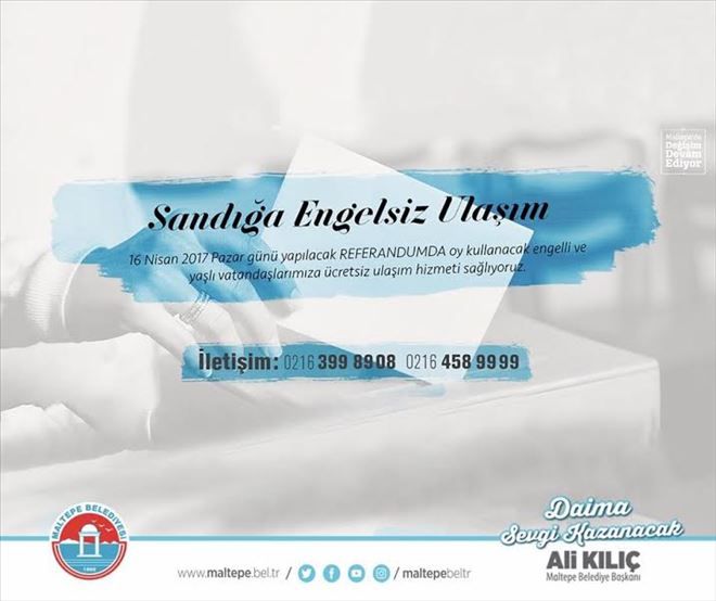 Maltepe Belediyesi, 16 Nisan 2017 Pazar günü yapılacak referandum için örnek bir çalışmaya imza atmaya hazırlanıyor. Belediye, sandığa ulaşım sıkıntısı yaşayacak engelli ve yaşlı yurttaşları gün boyu araçlarıyla oy kullanacakları sandıklara taşıyacak. Dileyen vatandaşlar 0216 399 89 08 ve 2016 458 99 99 numaralı telefonlardan belediyeye ulaşarak, ücretsiz ulaşım imkanından yararlanabilecek. Maltepe Belediye Başkanı Ali Kılıç, “Her bir hemşerimizin dilediği gibi, özgürce vatandaşlık görevini yerine getirebilmesi için elimizden ne geliyorsa yapmaya hazırız. Referandum günü araçlarımız Maltepe halkının hizmetinde olacak. Bu uygulamayı hem ülkemize, hem de halkımıza olan sorumluluğumuzun gereği olarak hayata geçireceğiz” dedi.
